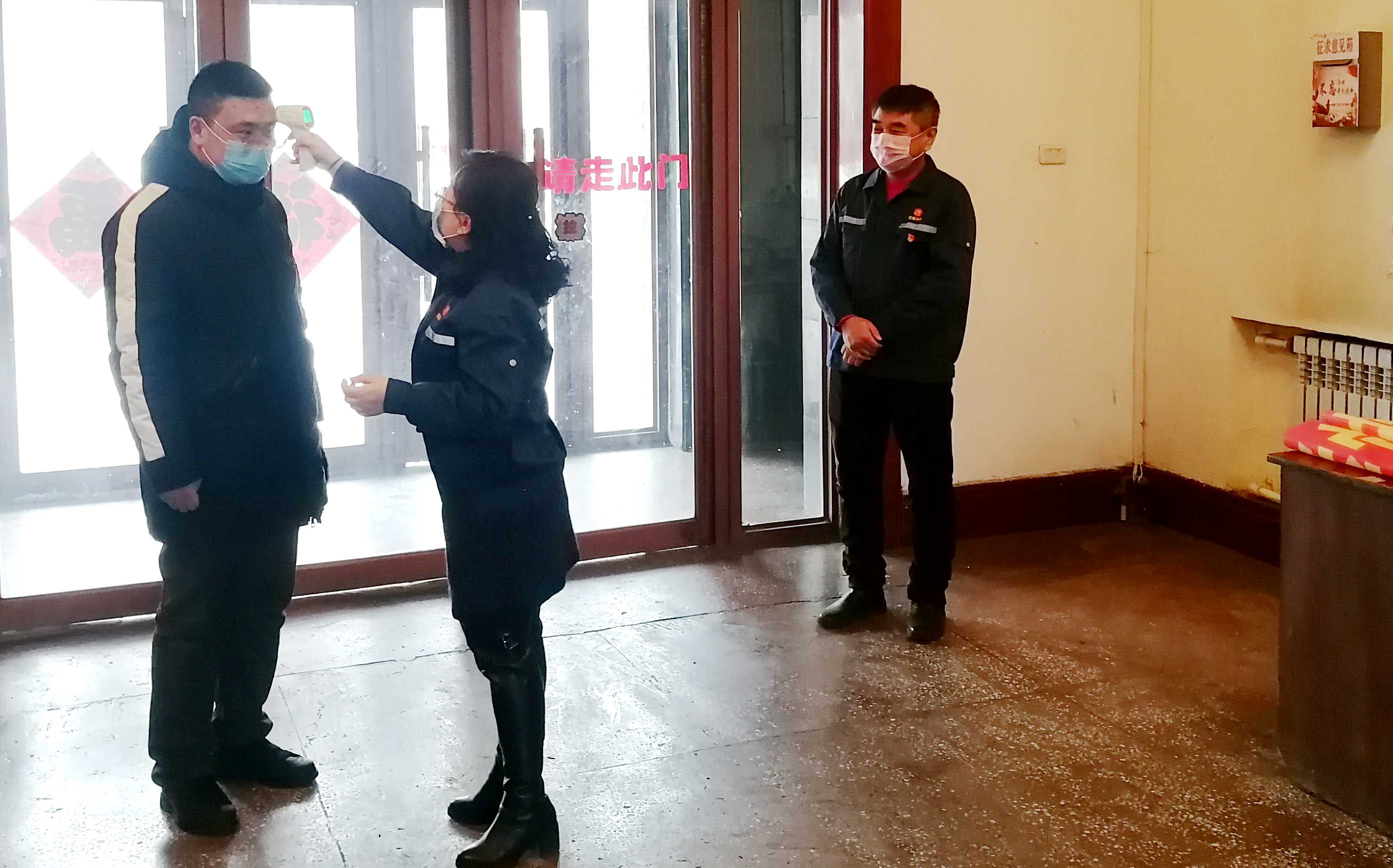 下层各单位对进入单位职员举行体温检测、对室内举行消毒
