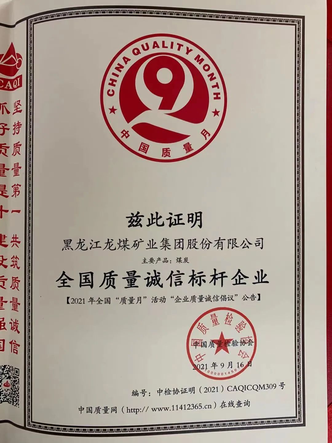 集团公司在中国质量磨练协会举行的《2021年天下“质量月”企业质量诚信建议》专题运动中,获得了“天下质量诚信标杆企业”称呼。