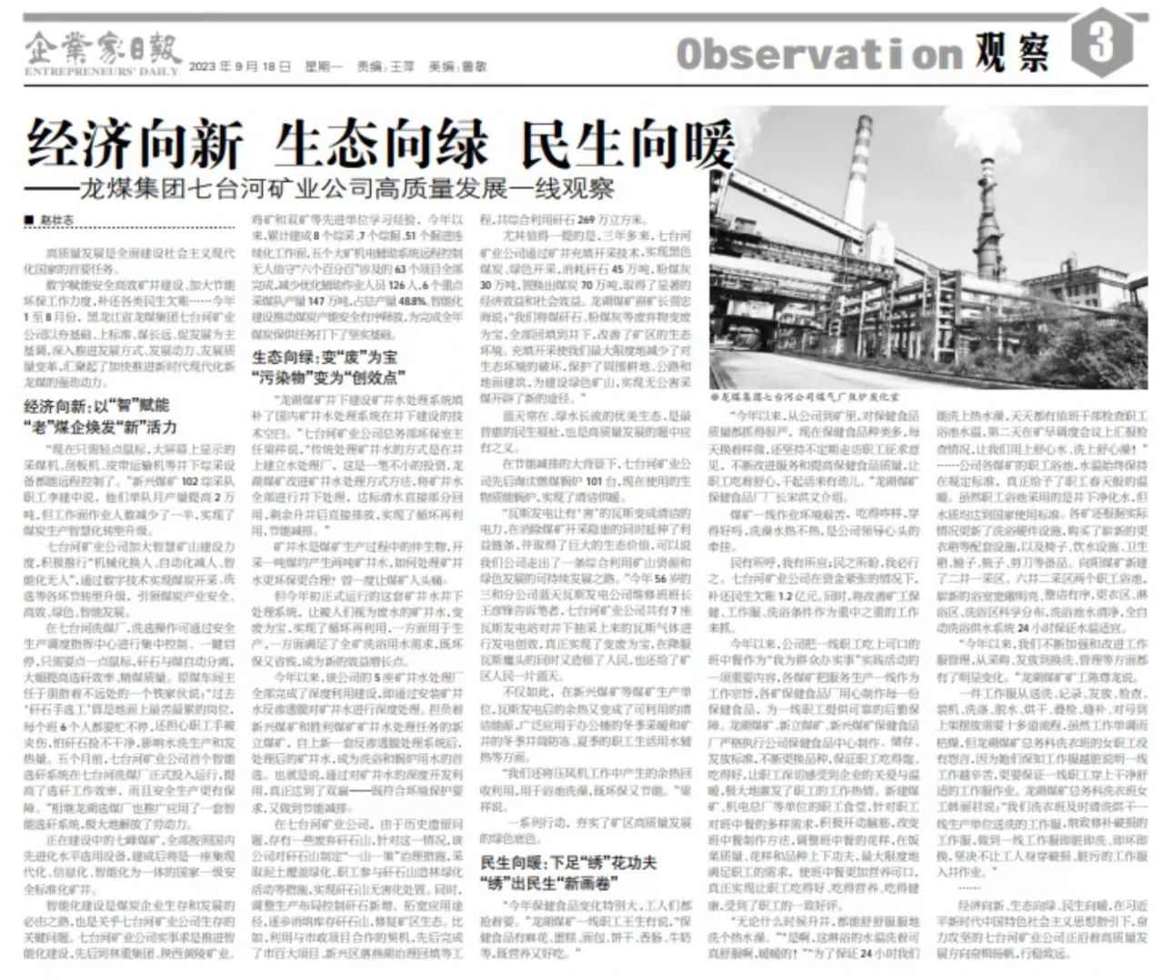 ¡¶ÆóÒµ¼ÒÈÕ±¨¡·2023Äê9ÔÂ18ÈÕÈý°æÓÚÏÔÖøÎ»Öÿ¯·¢ÎÄÕ£º¡¶¾­¼ÃÏòРÉú̬ÏòÂÌ ÃñÉúÏòů ¡ª¡ªAGÊÖ»ú°æ¹ÙÍø¼¯ÍÅÆß̨ºÓ¿óÒµ¹«Ë¾¸ßÖÊÁ¿Éú³¤Ò»ÏßÊӲ졷£¬È«ÎÄÈçÏ£º