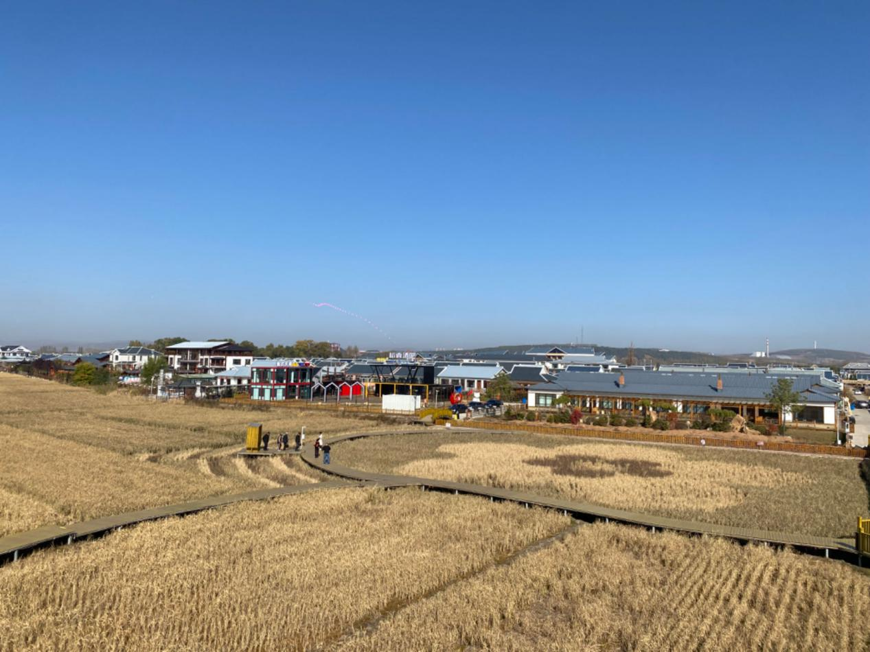 金色的稻浪陪衬着白墙黛瓦的朝鲜族特色民居,“墟落振兴 中兴先行”的褐色稻田画成为醉人景观。