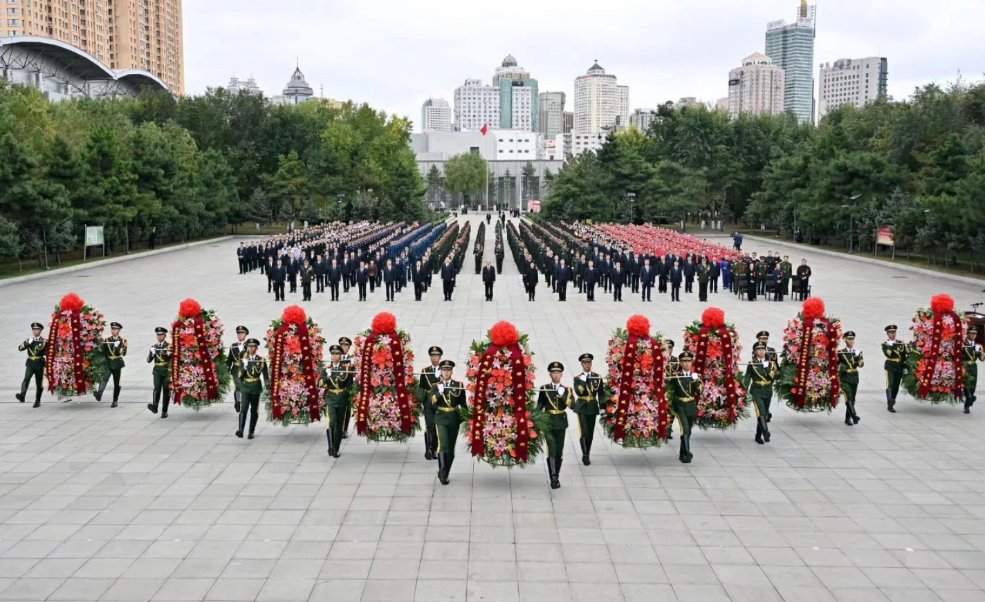方阵前 ,以省委 ,省人大常委会 ,省政府 ,省政协 ,驻省各步队 ,各民主党派、工商联和无党派人士 ,各人民整体和省及哈尔滨市各界群众 ,老同志、老战士和义士支属 ,少先队员名义敬献的9个大型花篮一字排开 ,花篮的红色缎带上誊写着“英雄义士永垂不朽”。