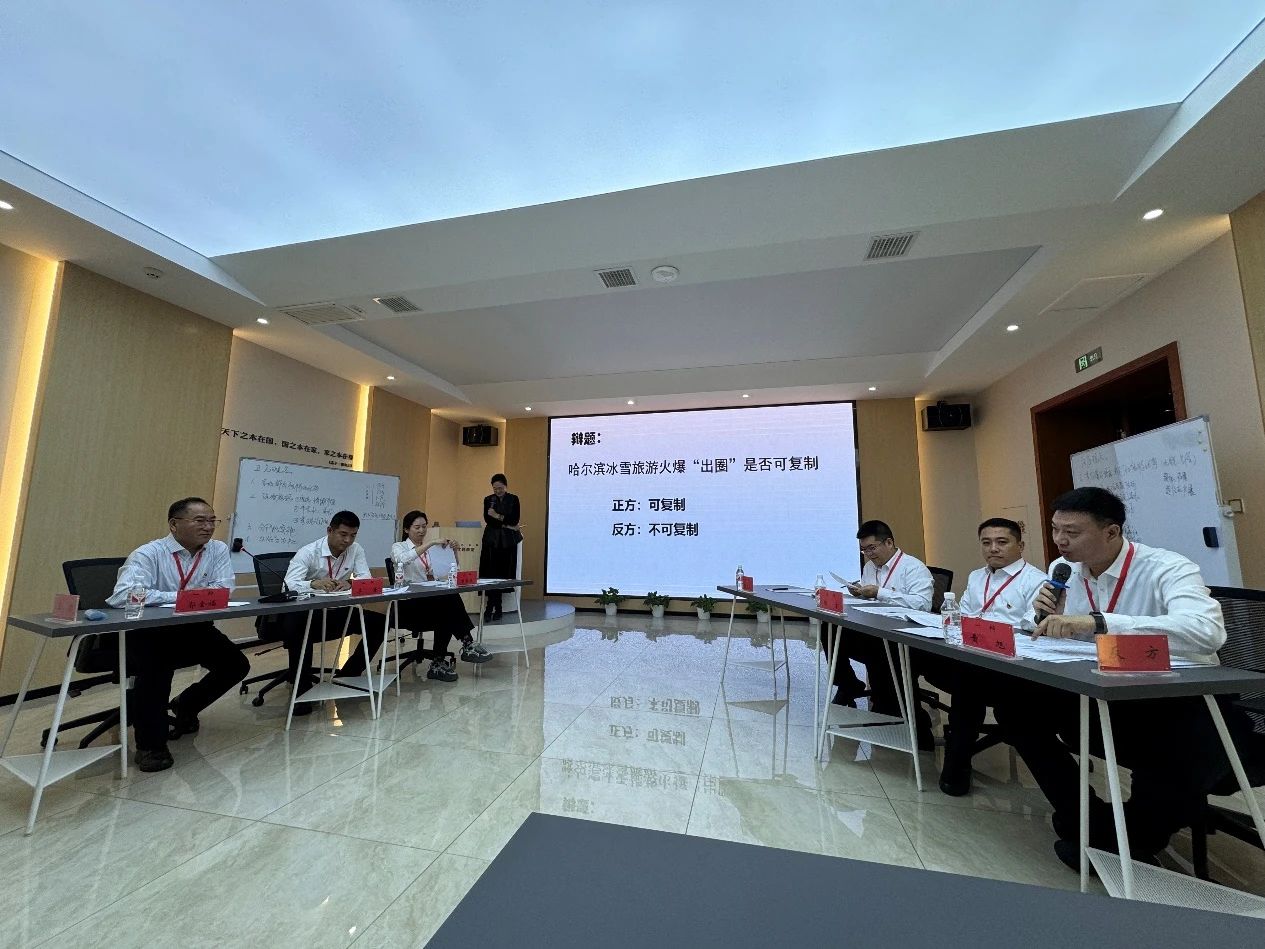 在辩说环节,加入运动的学员以“哈尔滨冰雪旅游火爆‘出圈’是否可复制”为辩题,正方选手站在可以复制的角度,从政府主导模式、流量密码运营方法等方面举行叙述,详细解说可以复制的理由;反方选手从地理自然、人文社会、理论逻辑等角度,叙述了不可复制的缘故原由,现场全体学员所有陷入深深思索当中。