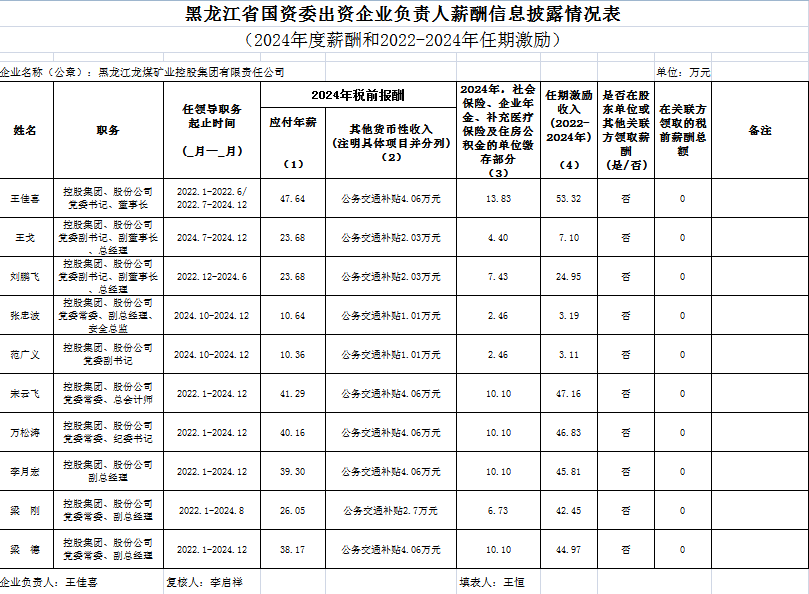 黑龙江省国资委出资企业认真人薪酬信息披露情形表(2024年度薪酬和2022-2024年任期激励)